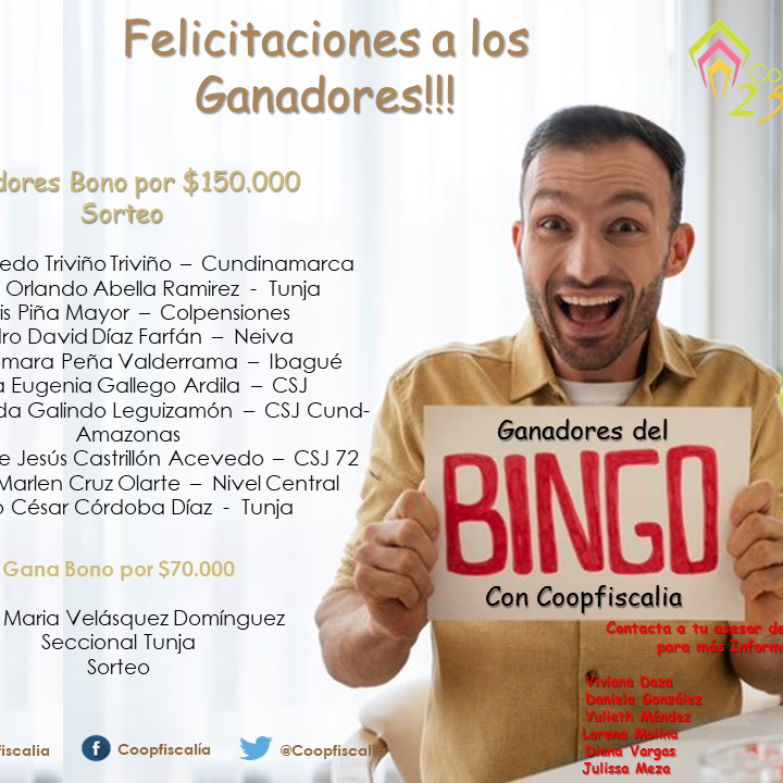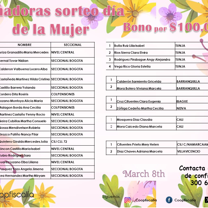 Conoce las asociadas ganadoras del sorteo con ocasión al mes de la Mujer Coopfiscalia publica las asociadas ganadoras de un espectacular bono por $100.000, sorteado el día 10 de abril de 2024 con ocasión al mes de la mujer, felicitamos a las ganadoras y las invitamos a seguir siendo parte de la familia Coopfiscalia,…